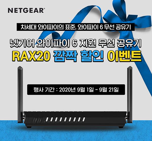 넷기어(한국지사장 김 진 겸 www.netgear.co.kr, 나스닥: NTGR)는 자사의 와이파이-6를 지원하는 AX1800 듀얼-밴드 무선 공유기 RAX20의 출시 이후 고객들의 높은 관심과 성원에 보답하고자 깜짝 할인 혜택 및 사은품을 증정하는 이벤트를 9월 1일부터 3주간 실시한다고 전했다.