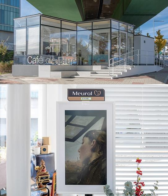 카페 드 블루 전경(위)과 뮤럴 캔버스 설치 모습(아래)