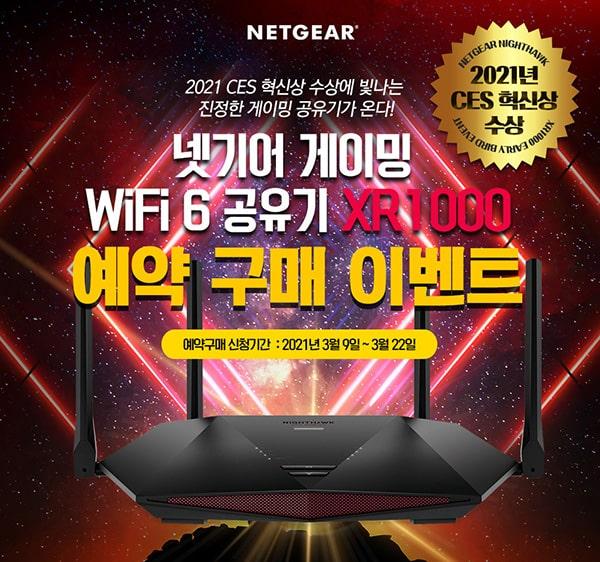 넷기어(한국지사장 김 진 겸 www.netgear.co.kr, 나스닥: NTGR)는 최신 와이파이 표준 기술인 와이파이 6를 지원하고 다양한 게이밍 전용 기능을 탑재한 게이밍 무선 공유기 XR1000의 국내 출시에 앞서 25% 할인 혜택을 제공하는 예약 구매 행사를 3월 9일부터 22일까지 2주간 실시한다.