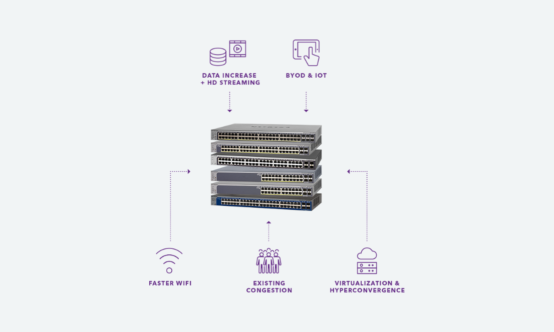 고객이 무엇을 요구하든, NETGEAR에서는 아주 유연한 코어, 분배 및 액세스 레이어 스위칭 솔루션을 사용하여 집중적 서비스, 서버 및 스토리지에 최종 사용자를 원활하게 연결할 수 있도록 최선을 다합니다.