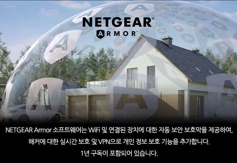NETGEAR ArmorTM 소프트웨어는 실시간 보호를 위해 WiFi 및 연결된 장치(PC, 휴대폰, 카메라, TV 등)에 대한 자동 보안 쉴드를 제공합니다. 1년 구독 포함