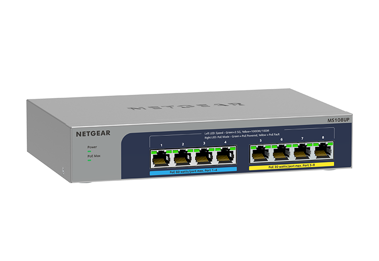 Biedt 8 poorten 1G/2.5G met 4 PoE+-poorten en 4 Ultra60 PoE++-poorten, waardoor het een perfecte switch is voor WiFi 6 AP-connectiviteit, IP-bewaking en meer. MS108UP MS108UP-100EUS MS108UP-100EUS