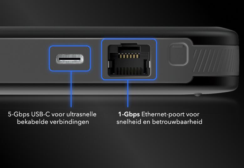 Bekabelde poort: 1 Gbps (Ethernet), 5 Gbps (USB)