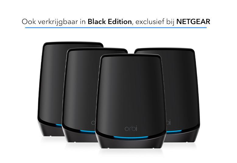 † De maximale draadloze signaalsnelheid is afgeleid van de specificaties in IEEE 802.11. De werkelijke datadoorvoer en draadloze dekking varieert en kan worden verlaagd door netwerk- en omgevingsomstandigheden, waaronder de omvang van het netwerkverkeer en constructie van het gebouw. NETGEAR geeft geen verklaringen of garanties over de compatibiliteit van dit product met alle toekomstige normen. Draadloze snelheden tot 6 Gbps bereikt bij verbinding met andere 802.11ax 6 Gbps-apparaten.