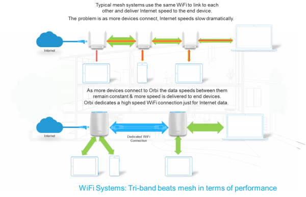 A Mesh WiFi system is basically when you have a WiFi router and one or more satellites (also known as extenders or nodes) that communicate with one another to extend your WiFi coverage throughout your home. A traditional non-mesh extender normally has a different SSID and password, and so the coverage isn’t as seamless as it is with a Mesh system, which pre-paired and has just one network name. Also, with traditional extenders and most of the competitive mesh systems, as your coverage increases, your speed tends to decrease, often by up to 50%. However, with NETGEAR Orbi Mesh WiFi systems , because they are tri-band, there is one dedicated connection strictly used between the router and its satellites to communicate, and therefore, there is no slow-down. You are effectively assured that you get the same internet speed on the Orbi satellite in the center of your home as you get on the router.
