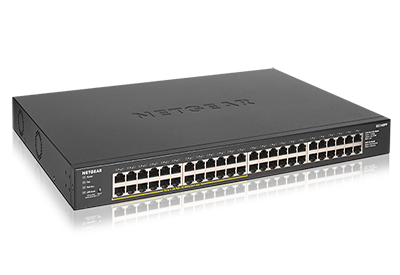 NETGEAR Essentials Switch featuring 48 ports of gigabit Ethernet with 24 PoE+ ports. Unmanaged Essentials Switches are easy, reliable, and affordable network connectivity for home and small offices. Providing power and data from a single Ethernet cable.
