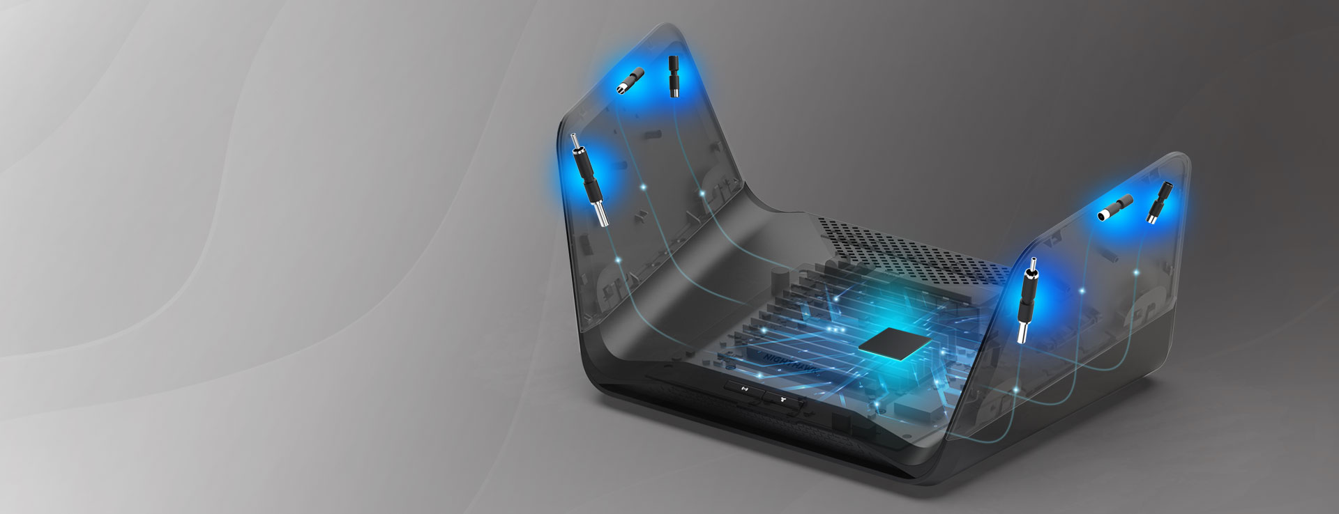 RAXE300 includes proprietary WiFi optimization and six optimally positioned antennas to deliver more capacity, stronger and more reliable connections, and less interference to your devices
