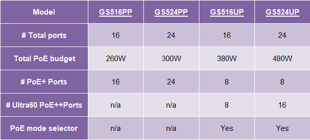 NETGEAR GS516PP. GS524PP, GS516UP and GS524UP are available and shipping today in the US, Europe and Asia with the following pricing;