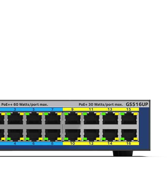 Simple plug-and-play, with more than enough to power the entire network. 8 high-power Ultra60 PoE++, and 8 PoE+ ports with a large budget to keep your devices always-ready. GS516UP GS516UP-100EUS GS516UP-100EUS